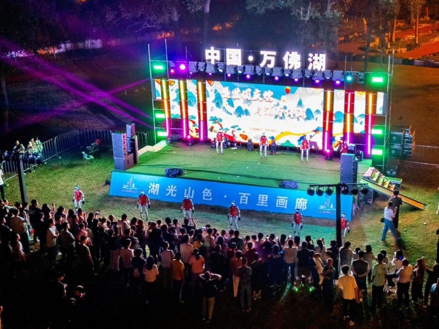 “白天在皖西大裂谷徒步探险,晚上去万佛湖看光影秀、花船剧,一天24小时都不够用!”来自杭州的游客吴涛在朋友圈分享了行程。为打破“白天观光、夜晚沉寂”的传统,六安市打造“日夜双场景”。日间,皖西大裂谷结合地质科普设计亲子路线,大别山风情谷推出庐剧体验、戏曲装扮;夜间,万佛湖构建“国潮+非遗+民俗”夜游矩阵,举办独龙族篝火晚会、非遗打铁花、《梁祝》主题花船情景剧,叠加国风巡游、竹竿舞互动等多元节点活动,夜场演出带动游客停留时长增长40%;金寨天堂寨开启“白+黑”模式,通过非遗与现代光影技术融合,打造沉浸式夜游项目,“化鱼成龙”夜游演艺活动自推出即成景区“流量担当”,鱼灯与龙灯穿梭于乡村田野,重现当地中秋鱼灯巡游的传统景象。
